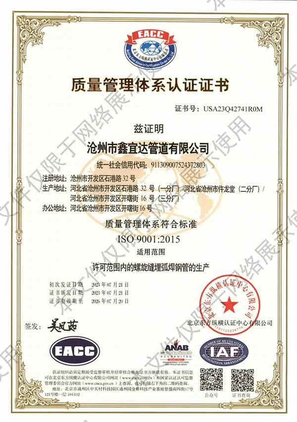滄州市鑫宜達(dá)管道有限公司成立于2003年7月,坐落于滄州經(jīng)濟(jì)開發(fā)區(qū),占地面積40萬平方米,注冊資金1.81億元,是集螺旋鋼管生產(chǎn)、防腐加工以及無縫鋼管、卷板、帶鋼等品類鋼材經(jīng)營銷售于一體的工貿(mào)型企業(yè)。公司現(xiàn)有員工400多人,其中,中高級(jí)技術(shù)職稱的人員達(dá)120余名。 滄州市鑫宜達(dá)管道有限公司擁有9條螺旋鋼管生產(chǎn)線和3PE防腐生產(chǎn)線,可生產(chǎn)直徑219--3640mm,壁厚5.5--28mm,最高鋼級(jí)X100的各種規(guī)格防腐螺旋鋼管...